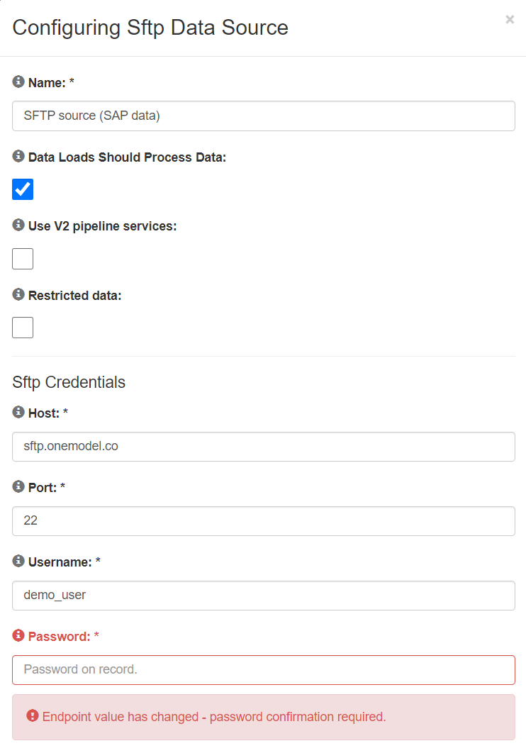 In order to improve data security for our customers, we have mandated that whenever a target URI is updated for a Data Source or Destination, the password must be re-entered. This prevents a type of attack where the attacker will update the URI to a tool that can then read the credentials set in our Data Source or Destination. (ref 7849) This will show in the UI like this: