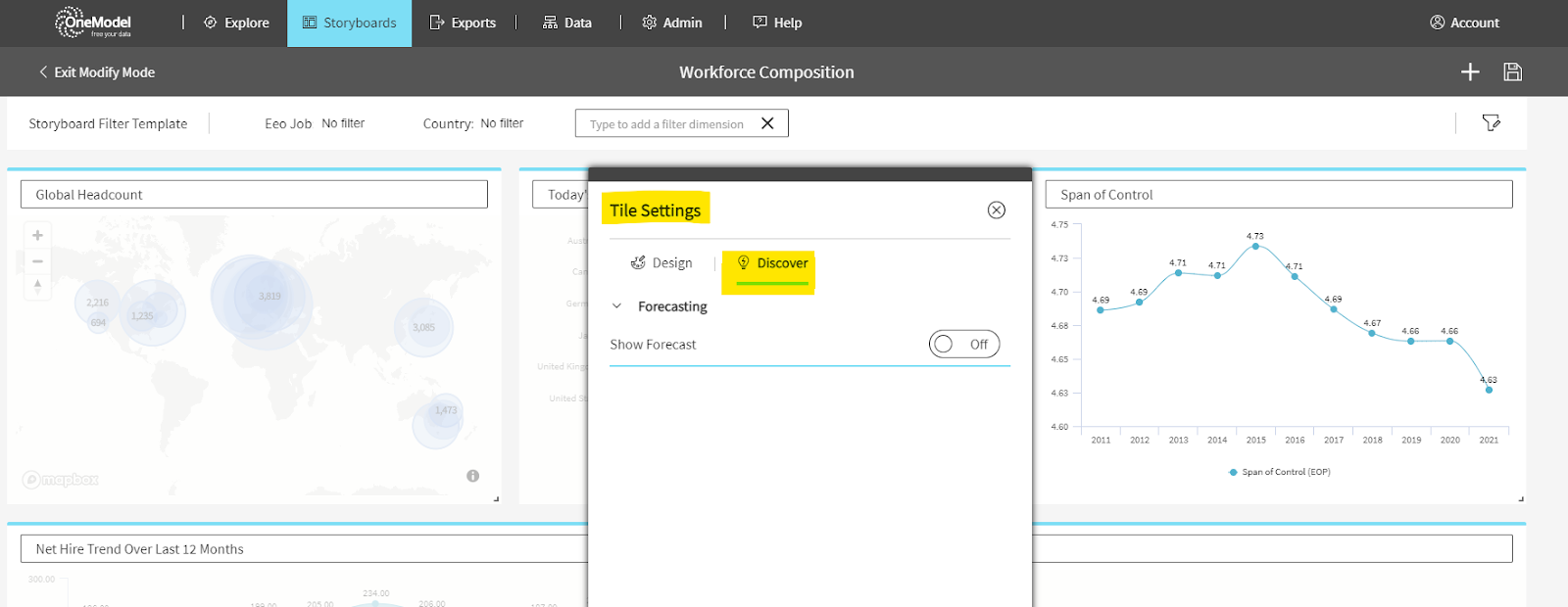 As the next step on our strategy to bring more OneAI capability into Storyboards we have a couple of subtle changes to the Storyboard Design Panel in this release. Firstly, the panel is now called Tile Settings as the options are more than just design options and when applicable we will start showing a new tab called "Discover" with all existing options under the "Design" tab. Discover is where you will see more advanced OneAI options appearing in the future. Today the Discover tab has the existing option to enable a forecast to run by default. Ensure your seatbelts are fastened as coming releases will start to reveal more exciting features here. (ref 8337)