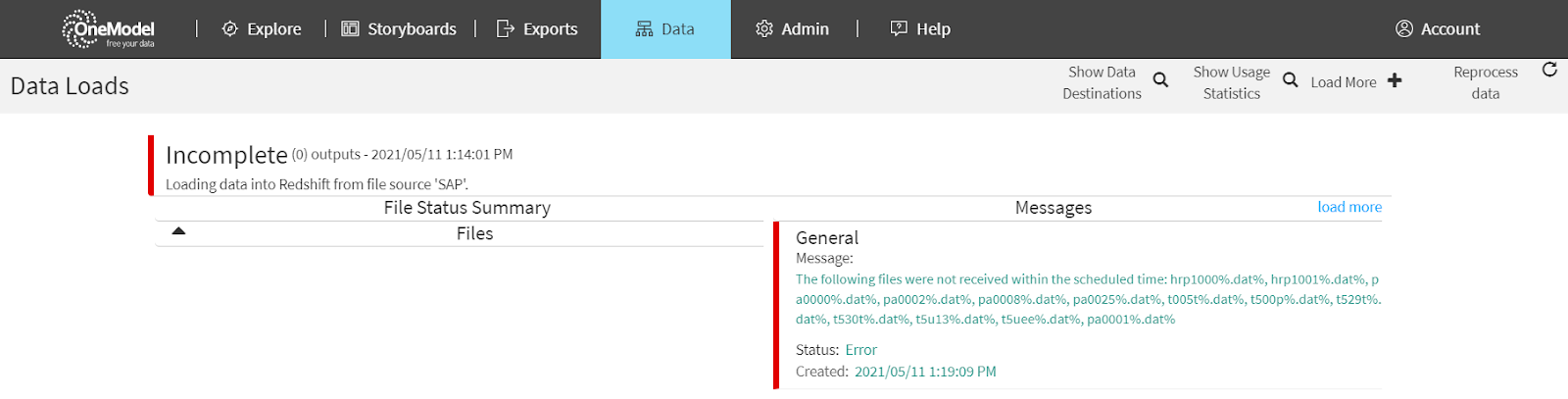 At the end of the “Time to receive files (minutes)” window, the data load will be marked as Incomplete if not all files have been received. An error message is also included to identify which files were missing: