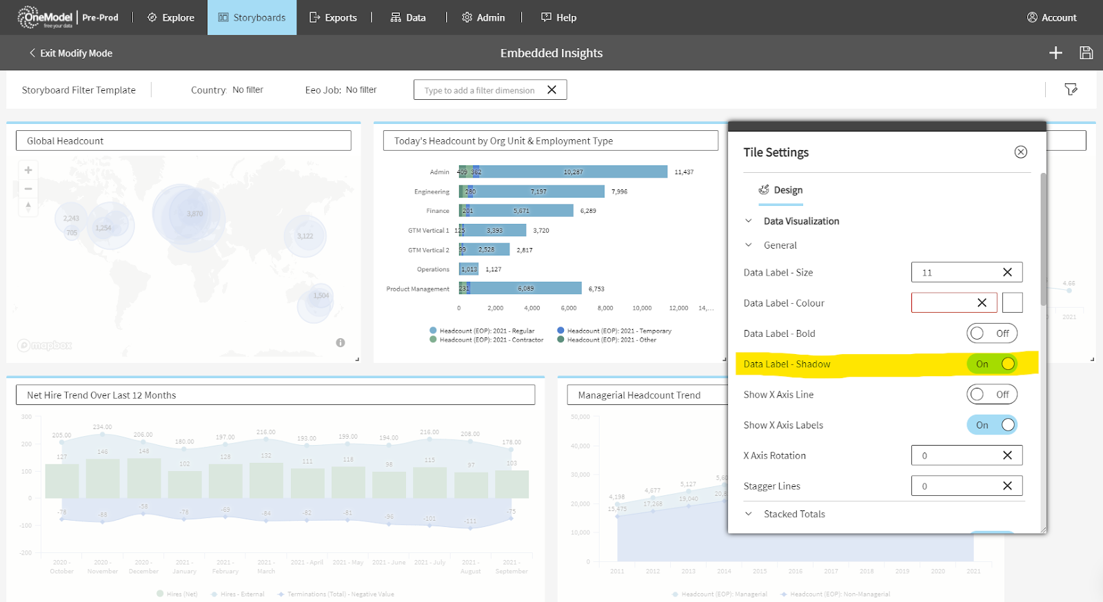 Most customers are now using our new Storyboard charting capability and we are continually refining and adding new features based on customer feedback. One small change you will see in this release is to the data labels on charts. Now when you turn on data labels we have added by default a subtle shadow effect so that the labels are easier to read no matter what the background colour of the chart is. This is particularly relevant when using stacked bar/column charts. We have also added an option to the Storyboard Design Panel to toggle this setting off for a particular chart if you like. (ref 9286)