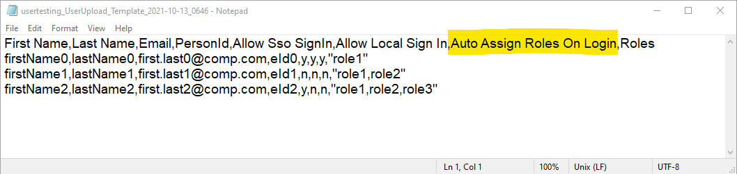 NB: Change impact - this change to the header for the .csv file means that any user upload files you are using will now need to be updated to reflect this hew label, otherwise they will fail to upload. Please refer to the example in the screenshot below: