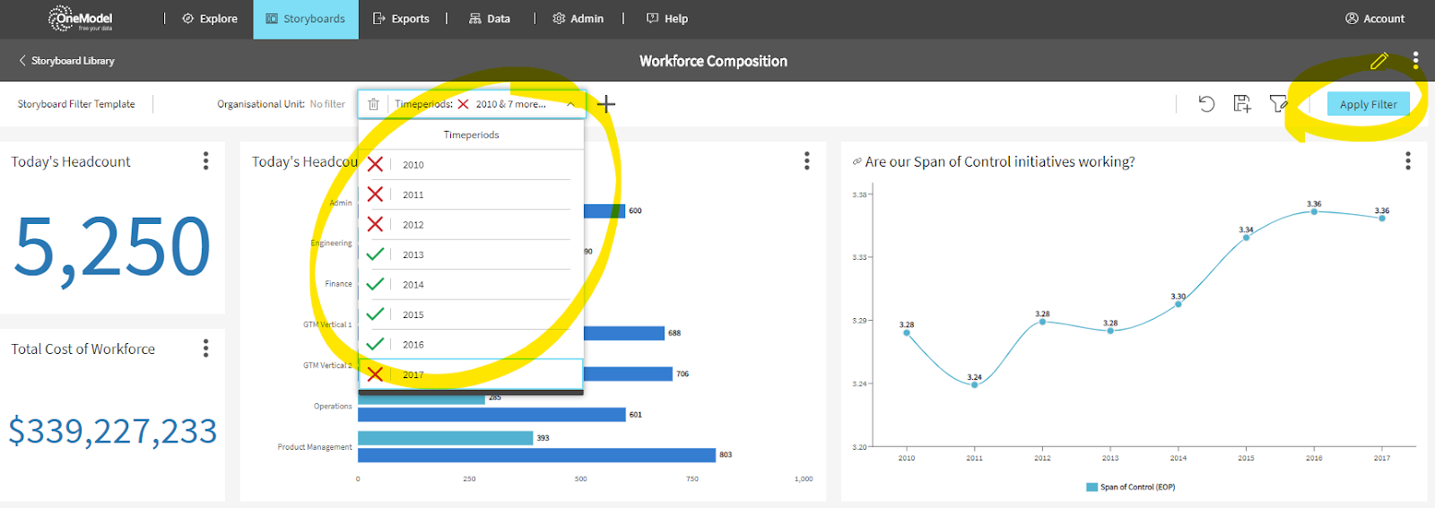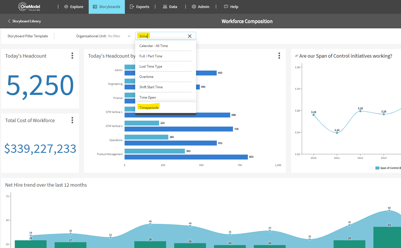 The new time filtering capability provides a lot of additional flexibility and control regarding how you design and deploy Storyboards. When deploying to casual users you might want to constrain a Storyboard to one time dimensions to make it easy for end users to understand how the time filter is being applied to the data they are viewing - lots of different time contexts might get confusing. Reach out to the One Model team for advice and tips to get the most out of this exciting new capability.