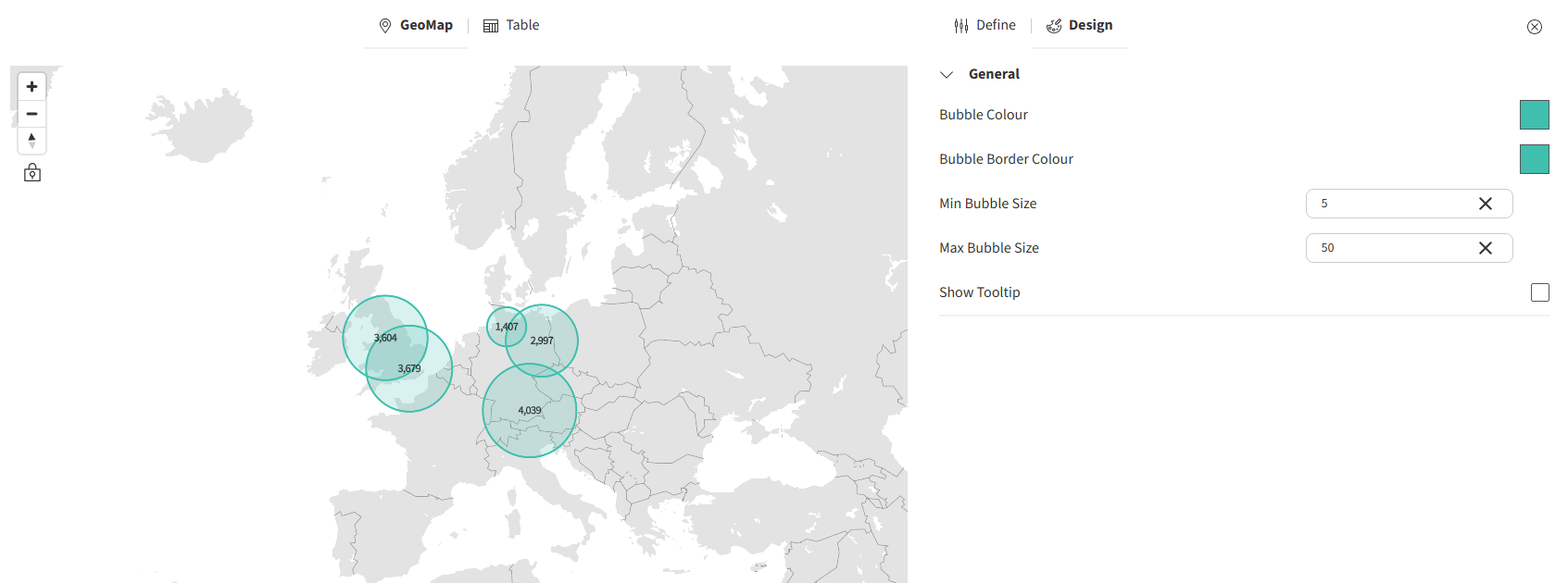 There are some nice design features available also. For users with permission to edit a Storyboard, you can use the new design panel to configure colour,relative bubble size and tooltip visibility. Additionally, we have added a nice feature that lets you control the initial view point for a given geomap by using the lock icon located near the top left of the geomap chart when in design mode. Unlock the map and then pan and zoom to your desired map view and then click the lock icon again. After you save the Storyboard this is the initial view users will see for the geomap (they will still be able to pan and zoom, this just sets the default position. This is particularly handy if you want to position multiple maps on a page with different perspectives.