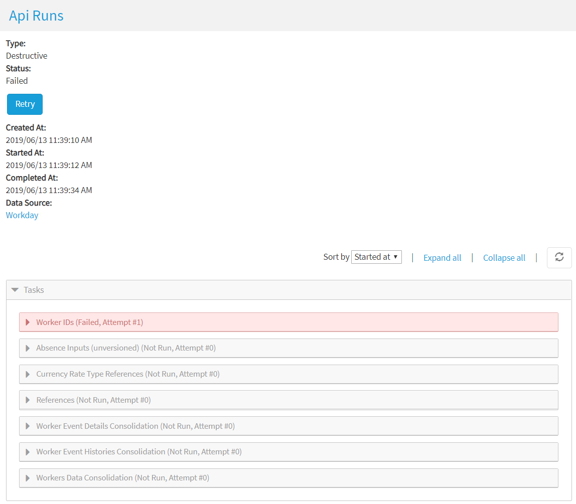 Allow users to Retry an API run from the task that has failed without reloading all tasks that have already succeeded. (ref 2405)