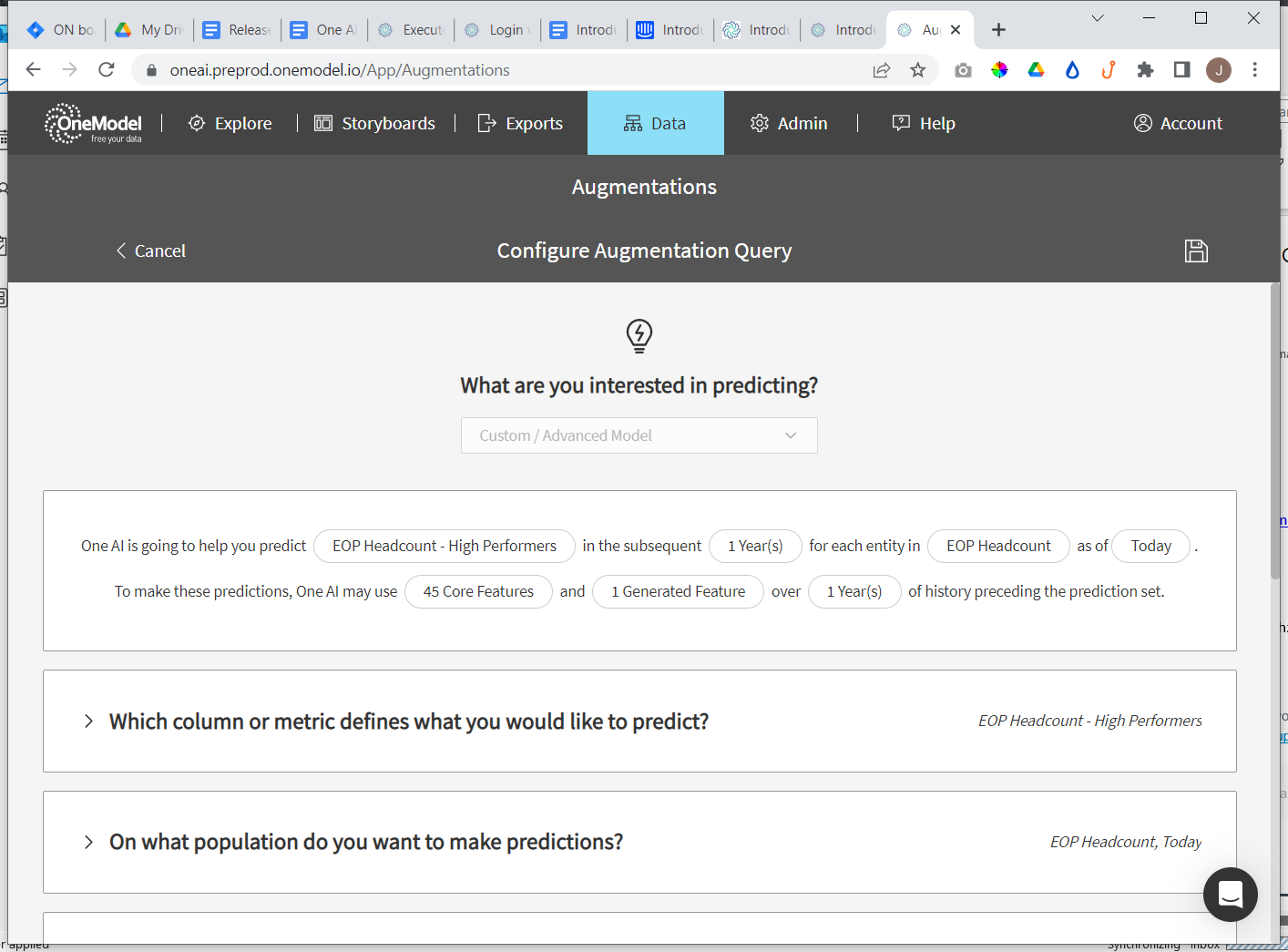 The One AI query builder for custom / advanced models has been added to One AI Recipes. Prior to this release, the Custom / Advanced Model option leveraged the legacy One AI query builder UX. Selecting Custom / Advanced Model from the What are you interested in predicting? dropdown now results in a guided question-and-answer layout that’s intuitive and consistent with other recipe types.